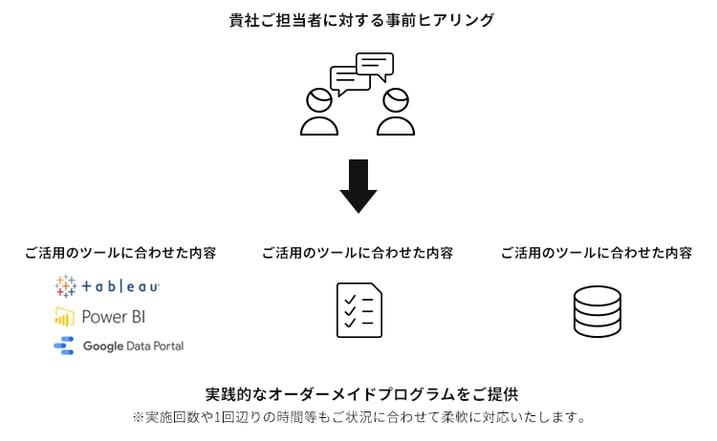 BI Learningでは事前にお客様のBIツールのご活用状況をお伺いした上で、各々に適したオーダーメイドのプログラムを構築しご提供いたします。