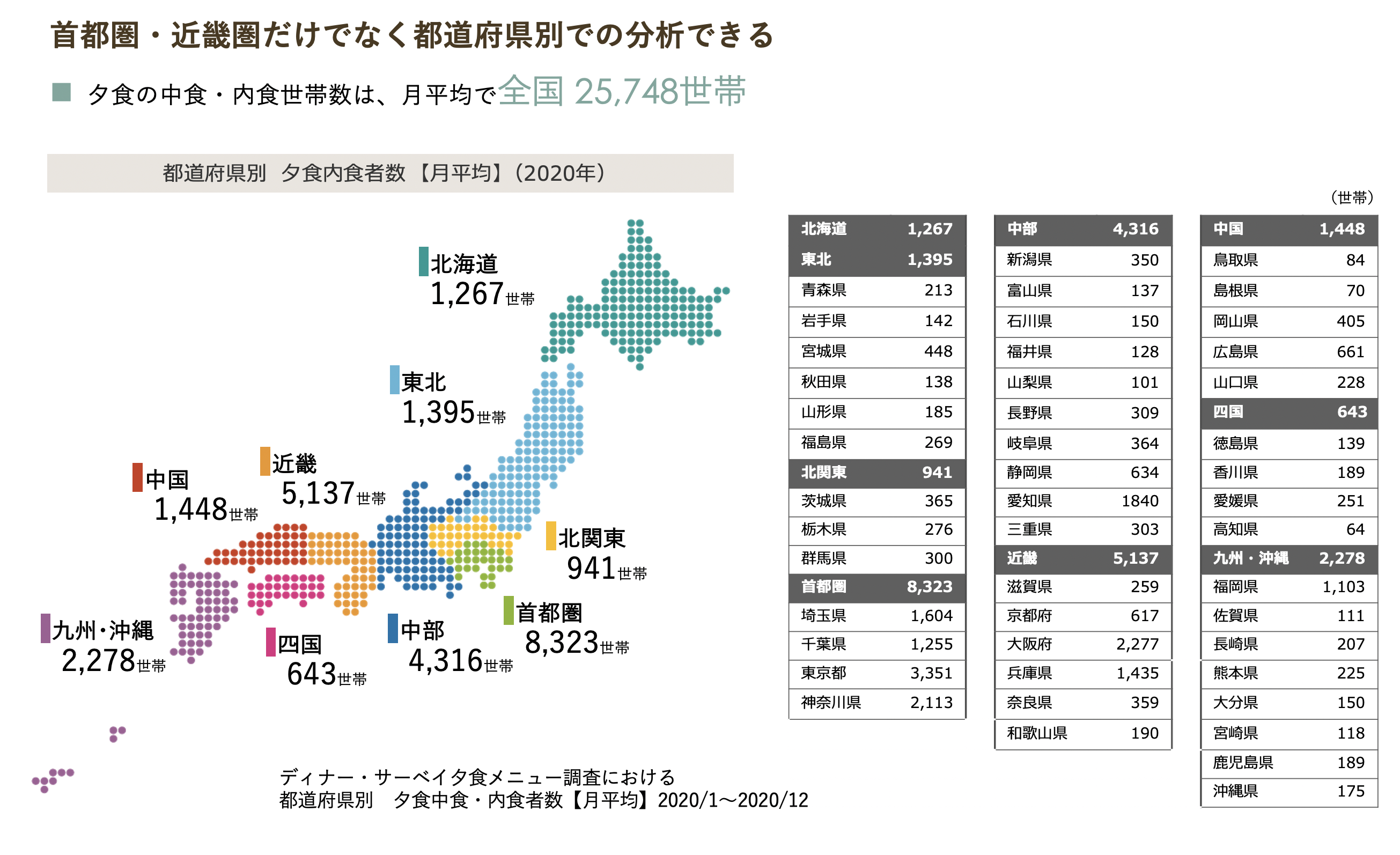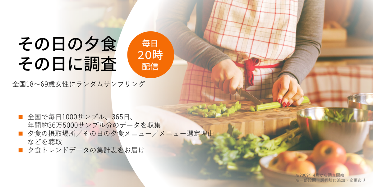 その日の夕食、その日に調査 「夕食メニュー調査」 「夕食メニュー調査」は、毎日の夕食のメニューやその選定理由、摂取場所などを聴取し、日々変化する夕食トレンドの把握に活用出来ます。効果的なMD計画の策定と生活者のリアルなメニュー選定・調理の実態把握を支援します。