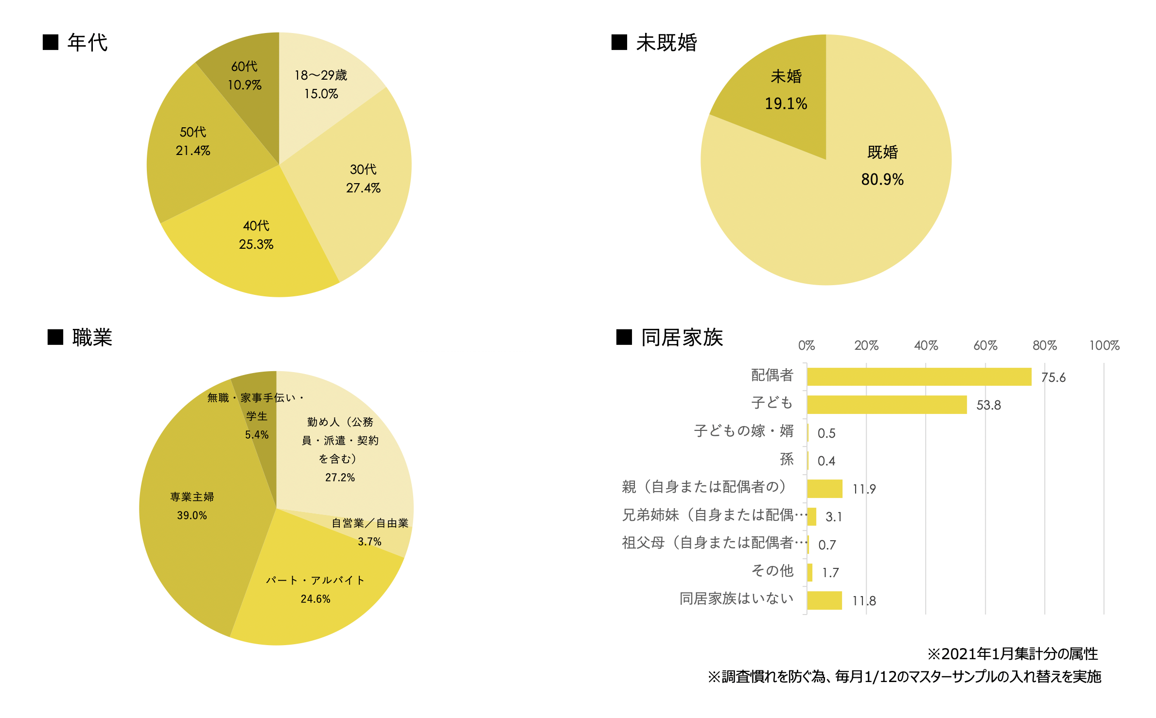年代/エリア(全国9エリア)/職業/未既婚/既婚年代/未婚年代/同居家族人数/同居家族/単身生活者年代/既婚者同居家族/世帯年収