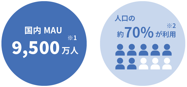 ※2 LINEの国内月間アクティブユーザー 9,500万人÷日本の総人口2508万2000人(2022年8月1日現在【確定値】総務省統計局)