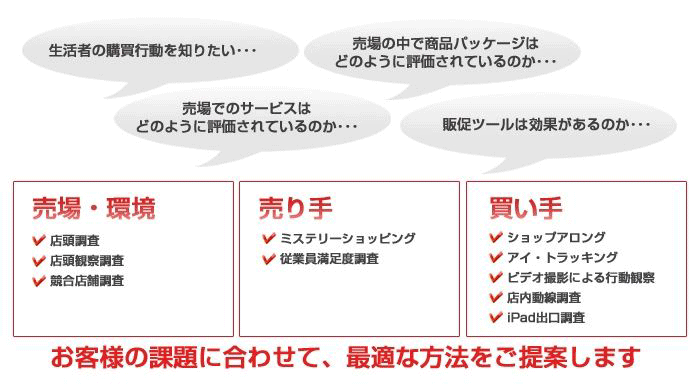 リアルな場でのお客様との接点を、店舗環境や接客オペレーション、コミュニケーションの観点から評価・診断する専門サービスをご提供しています。豊富な実績を活かし、「お客様目線」「高品質」なリサーチで導き出された課題への改善提案まで対応します。